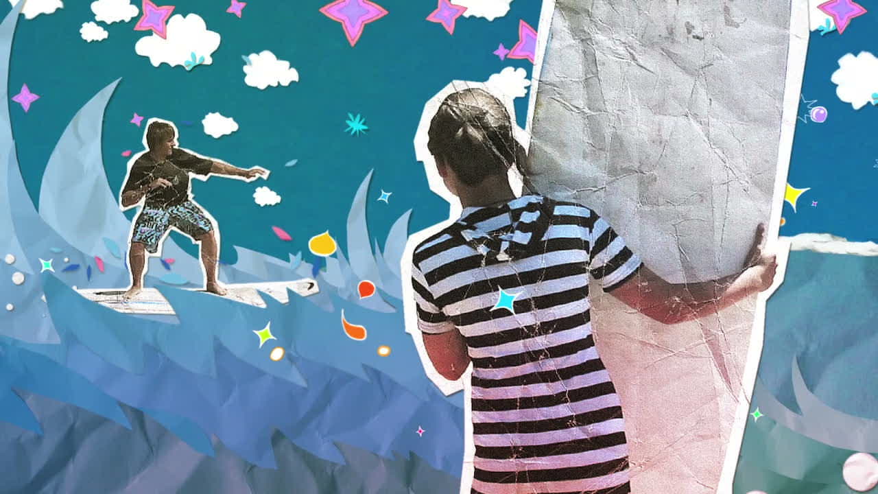 The visual concept combined stop-motion with crumpled paper textures, bringing together analog craft and digital motion in a playful, tactile way. Das Surfcamp was filmed on location in Moliets-et-Maâ, France. For the opening titles, over 700 pages were printed, physically crumpled using a custom technique, and reintegrated into the digital animation.